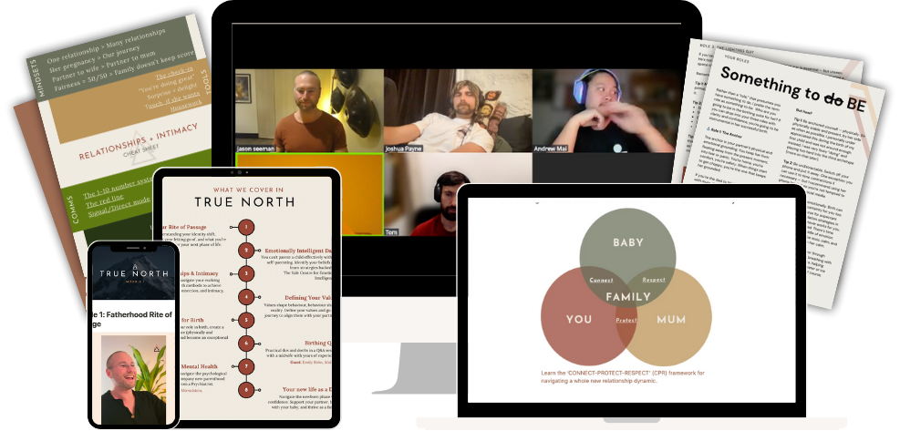 True North is an in-depth, evidence-based, Live-Online Course for expectant fathers to build confidence and clarity as they step into fatherhood.